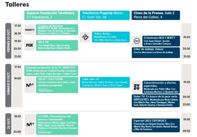 Otro clásico del Spoiler Fest son los talleres de temáticas muy diferentes pero con un denominador común: las series. En los distintos talleres participan expertos relevantes de la industria audiovisual y, mientras algunos de ellos -como el taller de doblaje impartido por Deluxe o el encuentro Birraseries- repiten tras anteriores ediciones, otros de ellos se estrenan este año con el objetivo de explorar los fenómenos televisivos más actuales: 'El fenómeno Rick y Morty' organizado por TNT, 'Caracterización y efectos especiales' de SyFy, o 'Police thriller: Realidad o ficción' de Calle 13 son algunos de ellos.