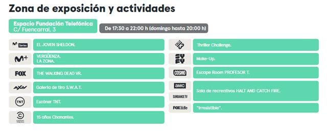 Entre las proyecciones y talleres en los que hayas escogido participar, podrás dedicar tu tiempo a numerosas y divertidas actividades en los diferentes stands de las distintas cadenas. La zona de exposición y actividades es de entrada libre y estará situada en el Espacio Fundación Telefónica (C/ Fuencarral, 3). Podrás disfrutar de las que más te interesen en desde las 17.30 a 22.00 horas, excepto el domingo, que serán sólo hasta las 20.00 horas.