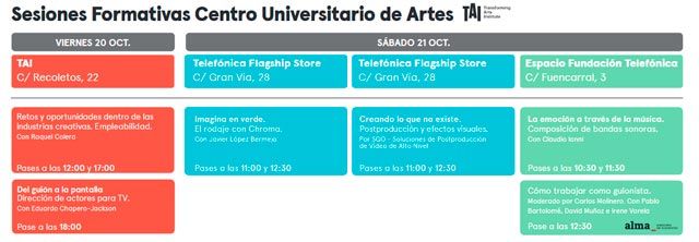 El Centro Universitario de Artes TAI colabora por segundo año como partner educativo de Movistar+ con el objetivo de ensalzar el valor del sector de la producción audiovisual y dar a conocer la proyección profesional que ofrece la industria. Para ello, TAI impartirá una serie de talleres temáticos que tendrán lugar tanto en su sede (Recoletos, 22), como en los distintos escenarios del Spoiler Fest (Telefónica Flagship Store, Fundación Telefónica y los Cines de la Prensa). "Retos y oportunidades dentro de las industrias creativas", "Del guion a la pantalla" o "La emoción a través de la música” (Composición de bandas sonoras) son algunos de ellos. Toma nota del resto a continaución: