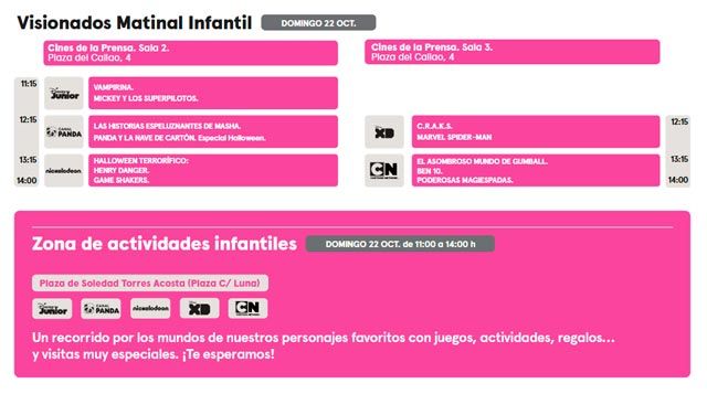 Los más pequeños también podrán disfrutar del Spoiler Fest, que dedicará la mañana del domingo a la proyección de algunas de las series infantiles más actuales: Vampirina (Disney Junior), Las aventuras espeluznantes de Masha (Canal Panda), o El asombroso mundo de Gumball (Cartoon Network), entre otras. Todas ellas en los Cines de la Prensa.