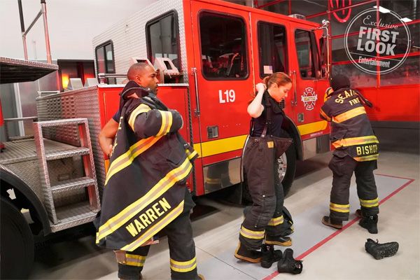 Entertainment Weekly ha publicado estas dos nuevas instantáneas en las que aparecen vistiéndose con sus trajes de bombero y hablando con la protagonista de la serie original, Meredith Grey, sobre algún rescate que acaba de tener lugar. Y es que como dice Stacy McKee, 'showrunner' de la serie, en este caso los héroes no solo salvan vidas, ponen también las suyas en el punto de mira.