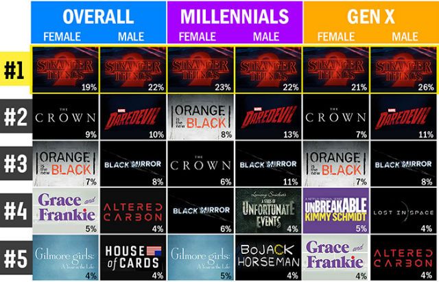 El drama The Crown ocupa el segundo lugar en general para las mujeres, aunque las Millennials prefieren la comedia Orange is the New Black y el drama real pasa a ocupar el tercer puesto en esta generación. Sin embargo, las mujeres pertenecientes a la Generación X prefieren antes el drama real a la comedia.