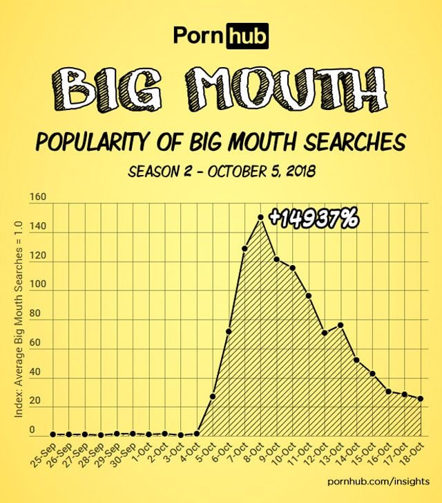 Pornhunb afirma también que poco más de una semana, 1 millón de personas han buscado Big Mouth en Pornhub. En el día donde alcanzó su pico más alto la búsqueda de ‘Big Mouth dibujos’ casi igualó a la de ‘dibujos animados’, una de las 20 más buscadas habitualmente en la página.