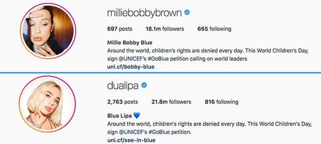 La joven heroína de Stranger Things no se implica solo en Hawkins, pues también se ha tomado muy a pecho su responsabilidad frente a UNICEF y, por ello, ha decidido dar un paso más lejos. ¿Cómo? Con el sencillo gesto de cambiar su apellido Brown por Blue en su cuenta oficial de Instagram. Aunque, quizás te estés preguntando qué tiene que ver el color azul en todo esto.