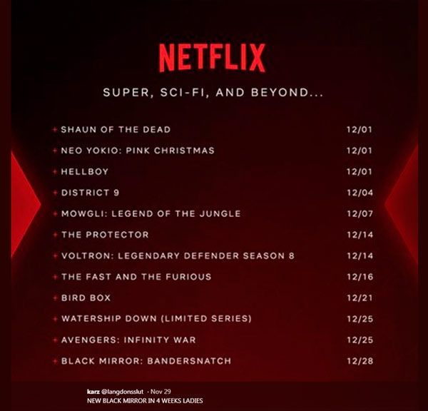 Puede que ya haya comenzado la cuenta atrás para ver el primer capítulo de la temporada 5 de Black Mirror. Según informa Mirror, la cuenta oficial de Netflix Sci-fi en Twitter publicó el calendario de estrenos de diciembre y, entre títulos ya confirmados como Mowgli, aparecía la llegada de Black Mirror el 28 del mismo mes. En concreto, especifica el estreno del episodio interactivo, que se titularía 'Bandersnatch'.