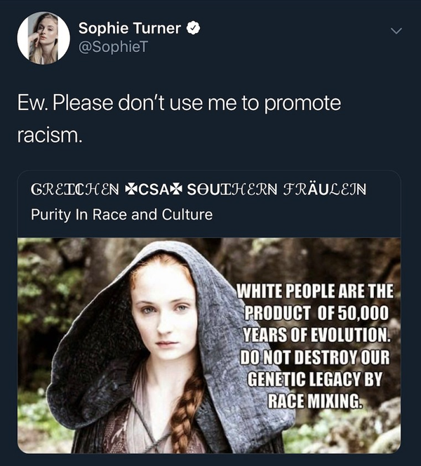 El meme en cuestión, acompañado por un mensaje que busca la "pureza en la raza y en la cultura", reza lo siguiente: "la gente blanca es producto de 50000 años de evolución. No destruyas el legado de nuestra genética mezclando la raza". Ante esto, Turner ha exigido que, por favor, no se utilice su imagen para promover el racismo, una decisión que ha sido aplaudida por sus fans.