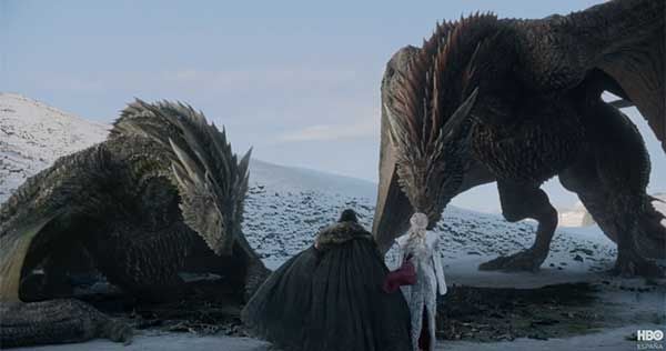 Al tiempo que los "hijos" del personaje de Emilia Clarke contemplan los restos de lo que parecen que ellos han quemado con su fuego, tanto ella como Kit Harington se acercan con cuidado hasta sus posiciones, ¿quizá para subirse a sus lomos? Están situados de forma que Drogon quede al lado de ella -es su dragón personal y su nombre viene dado por su fallecido marido, Khal Drogo- y Rhaegal al de él -su nombre viene dado por el hermano de Daenerys y padre de Jon, Rhaegar-. De esto verdad, Jon ya sabría en este momento de la acción quiénes son sus padres de verdad y por qué tiene derecho a ser el jinete de uno de los dragones.