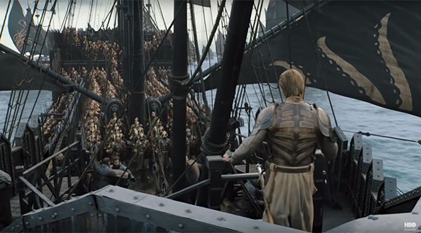 En la parte delantera de los buques se puede ver claramente el emblema de los Greyjoy, y en la siguiente escena comprobamos que dentro de ellos viaja la Compañía Dorada y de espaldas se encuentra alguien que se parece mucho a Jaime Lannister. Sin embargo, se trata de Marc Rissman dando vida a Harry Stickland, el líder de este ejército de mercenarios que ayudará a Cersei (Lena Headey) en esta batalla por Poniente.