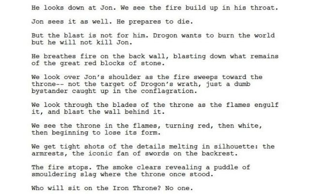 Como puedes comprobar, no especifica si el estúpido obstáculo es Jon o el propio trono, aunque previamente expresa la incapacidad de Drogon de dañar al amado de su madre, por lo que lo más lógico es pensar que el obstáculo es el codiciado Trono de Hierro. Las recién reveladas líneas también dejan entrever que el plan de Drogon y su ira van mucho más allá que un simple trono o Jon, aunque sí especifica que la quema del trono fue intencionada para evitar que se sentase alguien que no era su madre. Por tanto, a pesar de que las líneas arrojan luz a las cuestiones de la escena, aún queda espacio para la imaginación de la criticada escena.