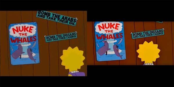 En la octava temporada, cuando Lisa visita la habitación de Nelson, se ven varios carteles y pegatinas pegados en las paredes. En la versión original se leían mensajes como "Destruid las ballenas", "Bombardead a los indios y tomad sus casinos" y "Bombardead a los árabes y tomad su aceite". En la versión panorámica, se elimina por completo la pegatina que está en la parte superior, quitando un poco de gracia al asunto de que Nelson está en contra de prácticamente todo lo que existe en el mundo.