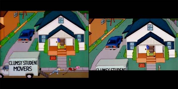 En la cuarta temporada, vemos un caminón de mudanza frente a la casa de los vecinos de los Simpson. En él se puede leer 'Clumsy student movers', lo que significa 'Estudiantes torpes para mudanzas'. Y es cierto, ya que en la escena uno de ellos rompe una lámpara. Al cortar la imagen apenas se llega a leer la parte superior del camión -'Estudiantes torpes'- y tampoco aparece el hombre rompiendo el objeto.