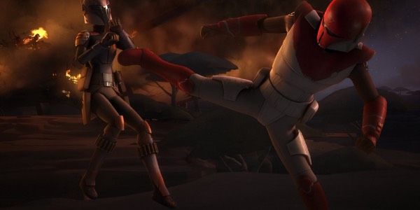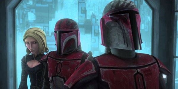 Resumiendo mucho las cosas, los mandalorianos de la serie animada Star Wars: The Clone Wars, ambientada durante los tres años que separan las películas-precuela El ataque de los clones (2002) y La venganza de los Sith (2005), se dividen entre los pacifistas y los beligerantes, estos últimos habitantes de la luna Concordia. Allí es también donde se forma el grupo terrorista Guardia de la Muerte, rival de la duquesa Satine Kryze.