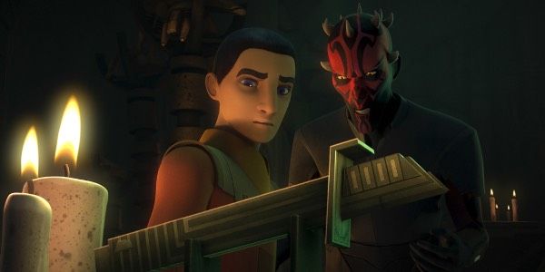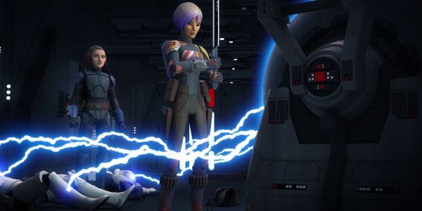 En 'Visiones y voces' (3x11), donde Ezra participa en Dathomir en un ritual para romper sus lazos con Maul y para obtener la información de los holocrones Jedi y Sith, Kanan y Sabine acaban siendo poseídos por espíritus de las Hermanas de la Noche. Y también volvemos a ver la Espada Oscura del clan Vizsla de The Clone Wars, al principio observada por Ezra junto a un muro con una representación de la duquesa Satine. "Si tu amiga mandaloriana estuviese aquí, podría explicártelo", le cuenta Maul. Ya libres del control de las Hermanas, al abandonar el planeta desolado, Sabine decide llevarse con ella la Espada como símbolo mandaloriano y, por tanto, se convierte en su propietaria.