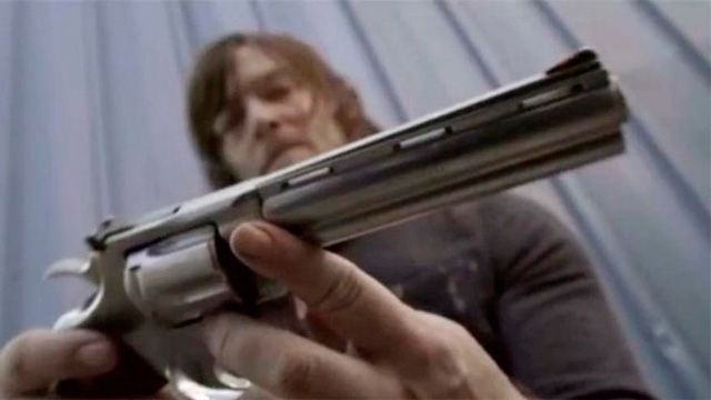 De momento, todo lo que tenemos es un revólver. SU revolver. En el pequeño 'teaser' lanzado por AMC adelantando la recta final de episodios puede verse a Daryl empuñando el arma del sheriff, la que usó para volar el puente en el que se produjo su presunta muerte: el revólver Colt Python de Rick Grimes.