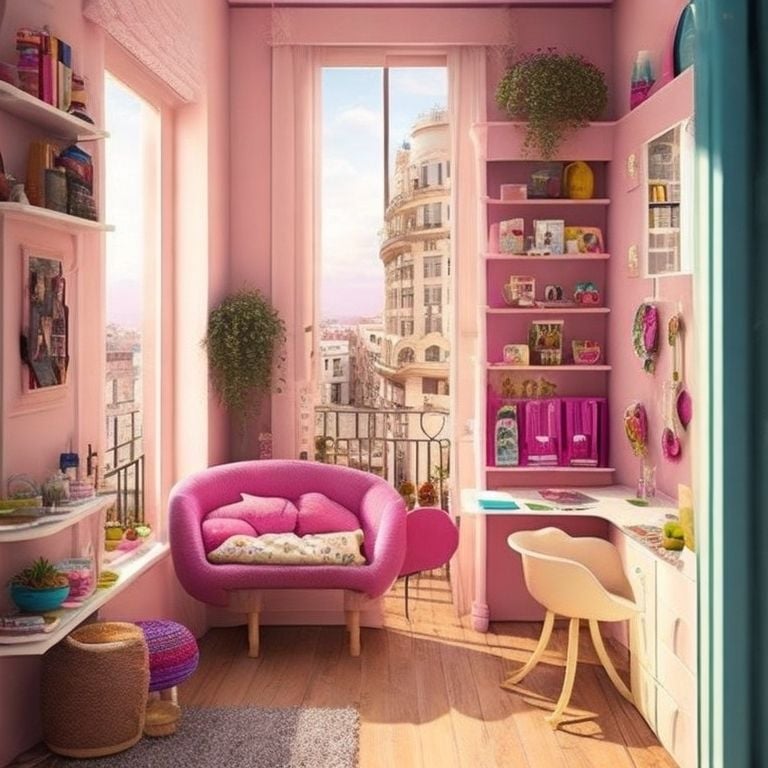 Todo muy bonito en la ficción, pero nada práctico en la vida real. "En las casas de ensueño asumes que nunca has tenido nada que desearas que fuera privado: no hay dónde esconderse", continúa. Ahora que tenemos la IA tan a mano, no nos ha quedado otra que preguntarle cómo podría ser la vida de Barbie en el madrileño barrio de Malasaña. ¿Cómo sería la casa de la muñeca en un piso de 50m2 en el centro de Madrid? Algo así: