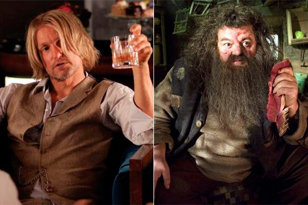 Haymitch Abernathy (Los juegos del hambre) y Rubeus Hagrid (Harry Potter) sirven de figura paternalista de nuestros héroes, de mentores buenos a la hora de dar consejos. Los dos disfrutan del alcohol -aunque con distintos fines-, pero ahí se acaba su parecido. No hay que olvidar que Haymitch salió victorioso de uno de los Vasallajes, mientras que Hagrid no puede hacerle daño ni a una araña. Literalmente. Eso sí, los dos viven un destierro más o menos evidente. El primero se consuela en la bebida por todas las muertes que ha tenido que ver y el segundo tiene prohibido hacer magia dentro y fuera de Hogwarts.