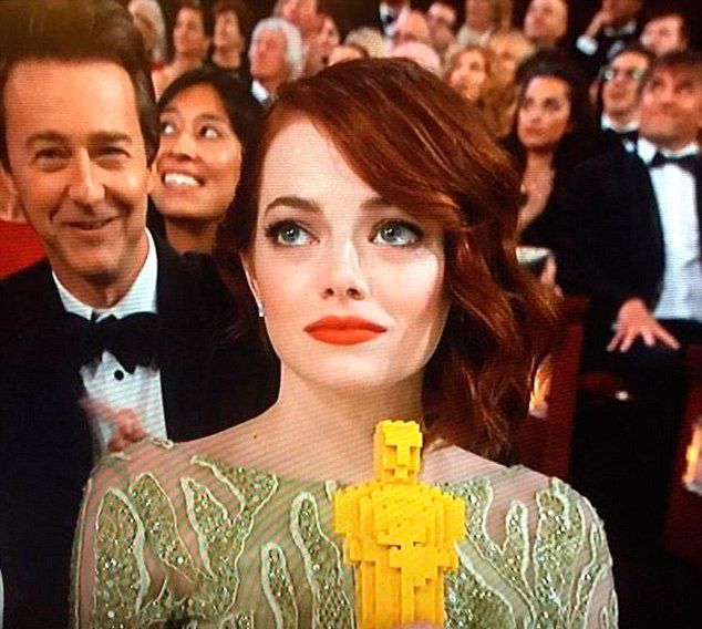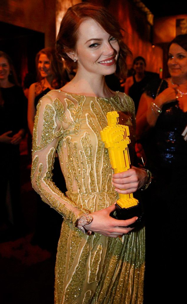 Emma Stone (Birdman), presumiendo de nuevo con su Oscar 'LEGOlizado'.