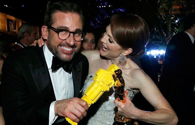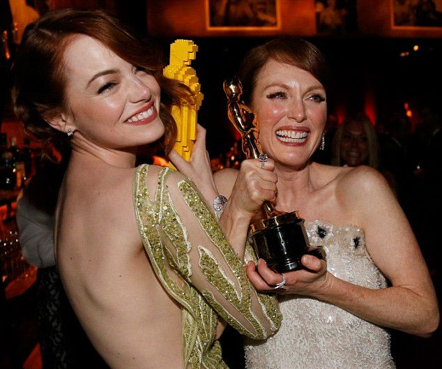 Emma Stone y Julianne Moore, juntas con el Oscar real y el Oscar versión LEGO.