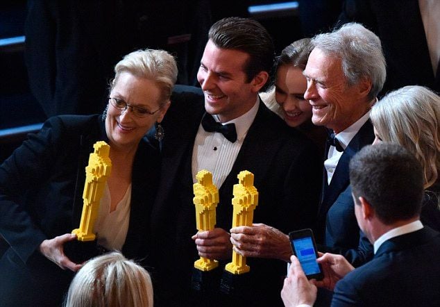 Meryl Streep (Into the Woods), Bradley Cooper y Clint Eastwood (El francotirador) posan con sus Oscar LEGO.