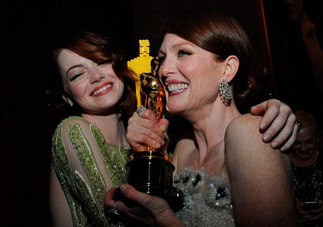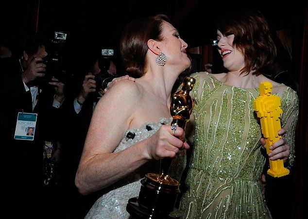 Emma Stone (Birdman) también presumió de 'premio' junto a Julianne Moore (Siempre Alice).
