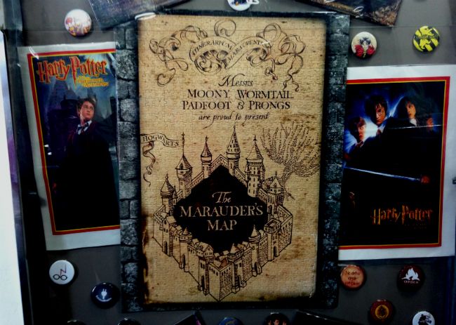 Las paredes de la habitación decoradas con banderas y otros objetos de las casas