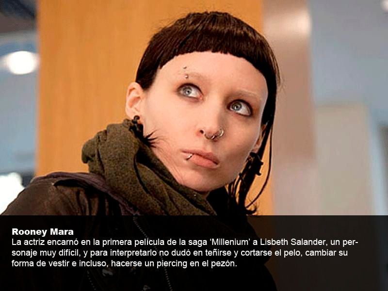 La actriz encarnó en la primera película de la saga Millenium a Lisbeth Salander, un personaje muy difícil, y para interpretarlo no dudó en teñirse y cortarse el pelo, cambiar su forma de vestir e incluso, hacerse un piercing en el pezón.