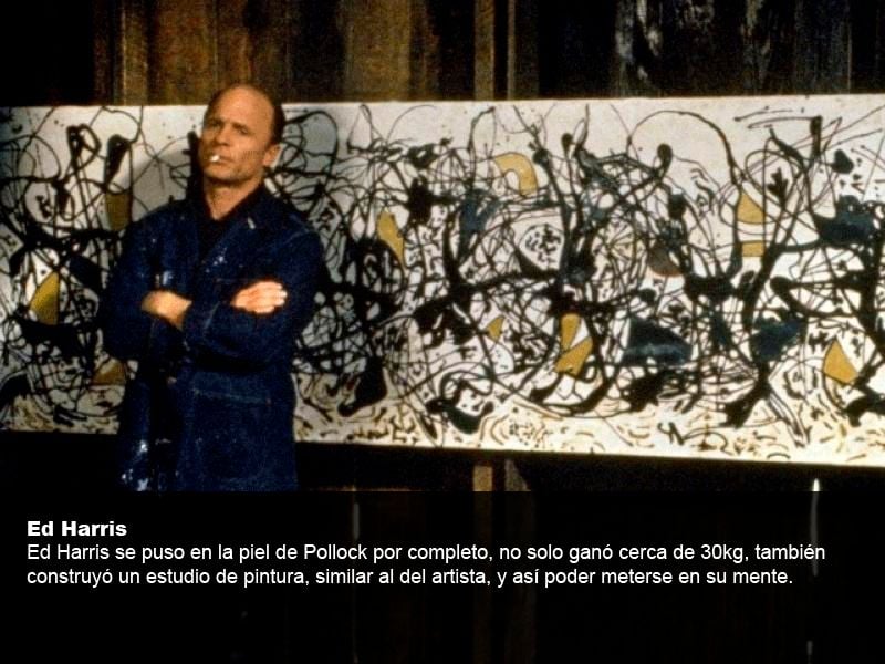 Ed Harris se puso en la piel de Pollock por completo, no solo ganó cerca de 30kg, también construyó un estudio de pintura, similar al del artista, y así poder meterse en su mente.