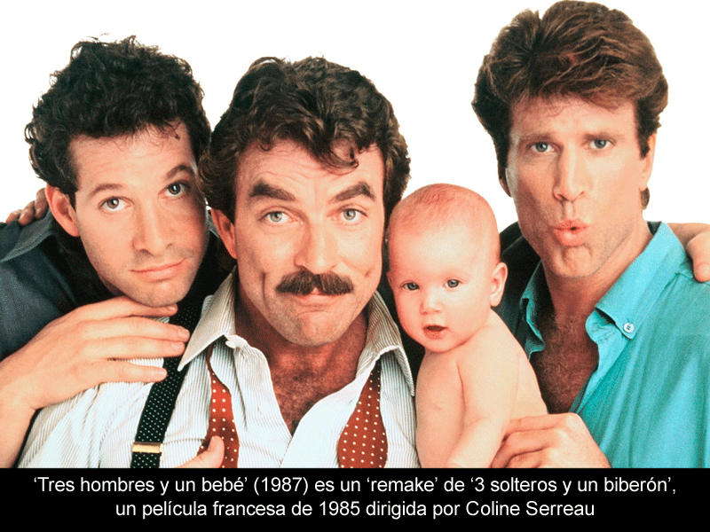 La cinta de 1987, protagonizada por Tom Selleck, Steve Guttenberg y Ted Danson, es un 'remake' de la francesa de 1985, Tres solteros y un biberón, de Coline Serreau. Tres hombres y un bebé
