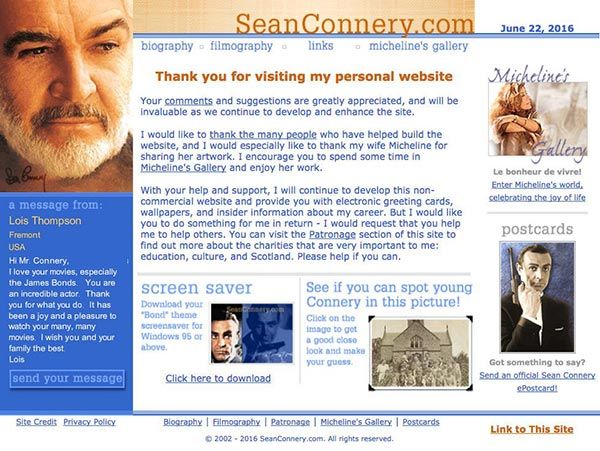 La primera de las webs que recoge Business Insider es ésta dedicada al prestigioso actor escocés, retirado del cine tras La liga de los hombres extraordinarios. Dicha página sigue en activo, y brinda a los usuarios la atractiva posibilidad de descargarse varios salvapantallas de James Bond, además de echarle un vistazo a los cuadros de su esposa Micheline.