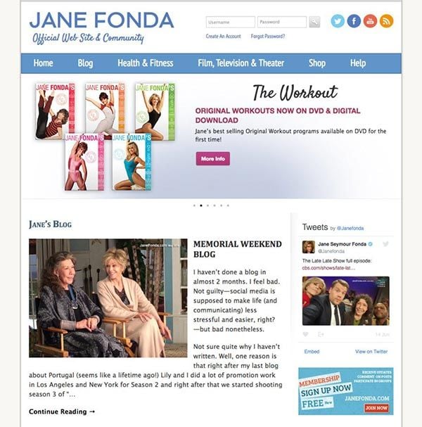 Otro ejemplo de interfaz caótica, en la que podemos encontrar de todo: una tienda online con las películas y los vídeos de aerobic de la actriz -y mucho más-, un blog personal en el que opina periódicamente sobre cualquier tema, e incluso una red social llamada "Jane Fonda Community". Con un sitio web tan completo, ¿quién necesita Twitter o Instagram?