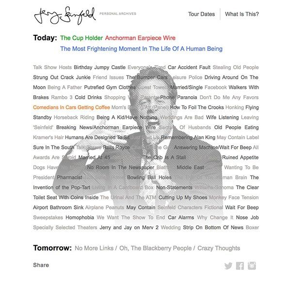 A primera vista, uno no sabe qué hacer con una página así, llena de palabras al azar ("Revistas de Novia", "Rinoplastia", "Transmítele mis saludos a tus pelotas") diseminadas por su pantalla. Sin embargo, todo tiene bastante sentido: cada una de ellas conduce a una actuación televisiva del cómico, que según parece se ha preocupado por grabar en vídeo todas y cada una de ellas. Nuevamente, la pedestre presentación echa a perder el contenido.