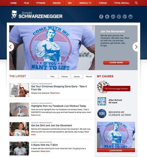 Resulta sorprendente que una estrella como Arnold Schwarzenegger -que incluso ha incursionado de manera exitosa en la poítica- no se pueda permitir un sitio web de aspecto algo más pulido, pero así parece ser. Ni él mismo parece preocuparse mucho por su mantenimiento, pues este año sólo ha sido actualizada en un par de ocasiones, entre las cuales se incluye el enésimo intento de vender camisetas.