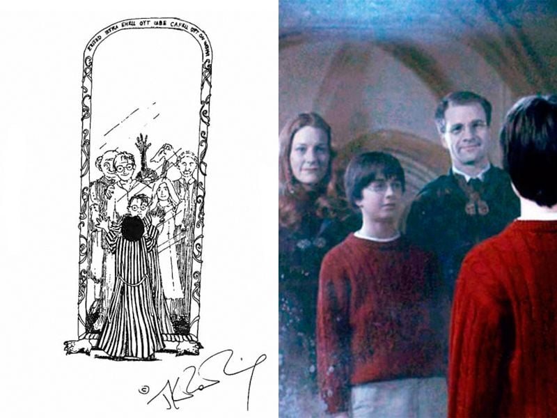 En su adaptación a la pantalla, las personas que Harry veía en este espejo se reducían a dos, su padre y su madre, mientras que su indumentaria pasaba de una bata para dormir a un jersey rojo.
