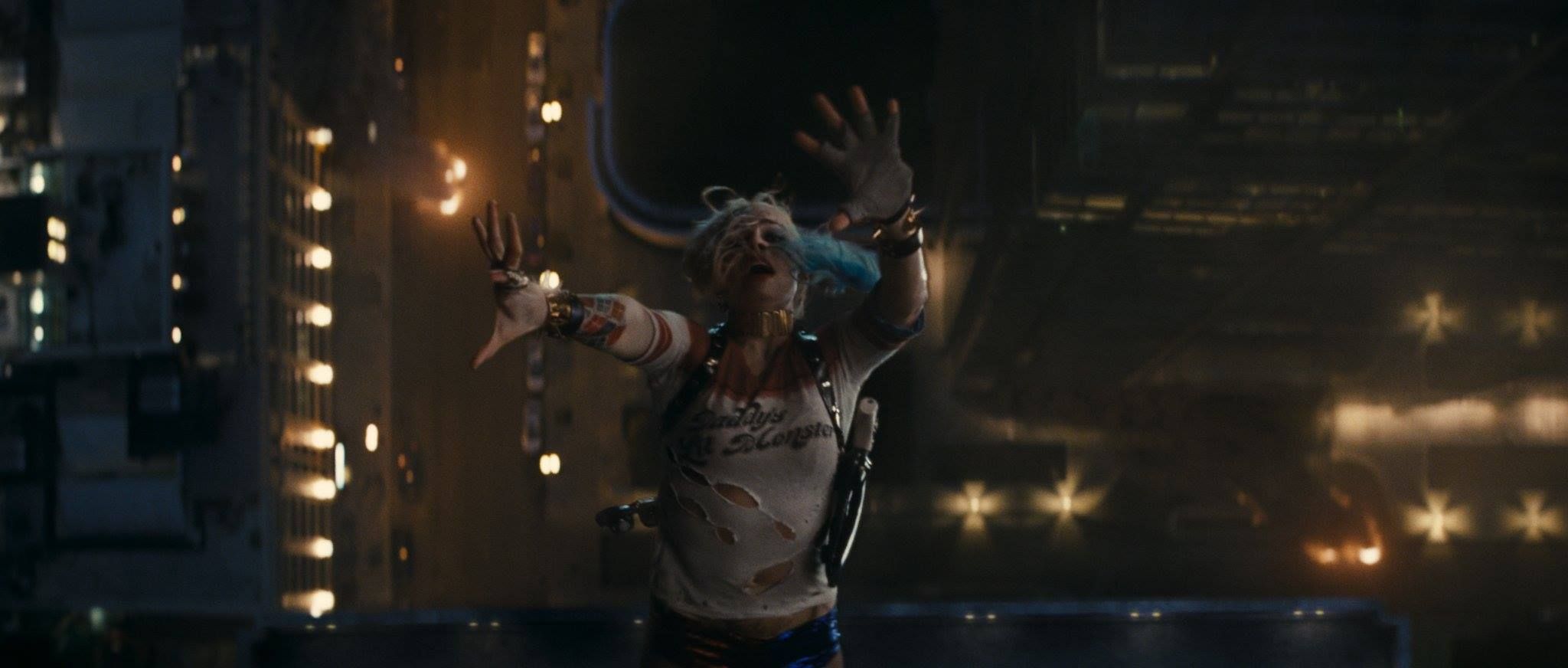 Harley Quinn (Margot Robbie) cae desde el helicóptero con el que la ha rescatado El Joker (Jared Leto).