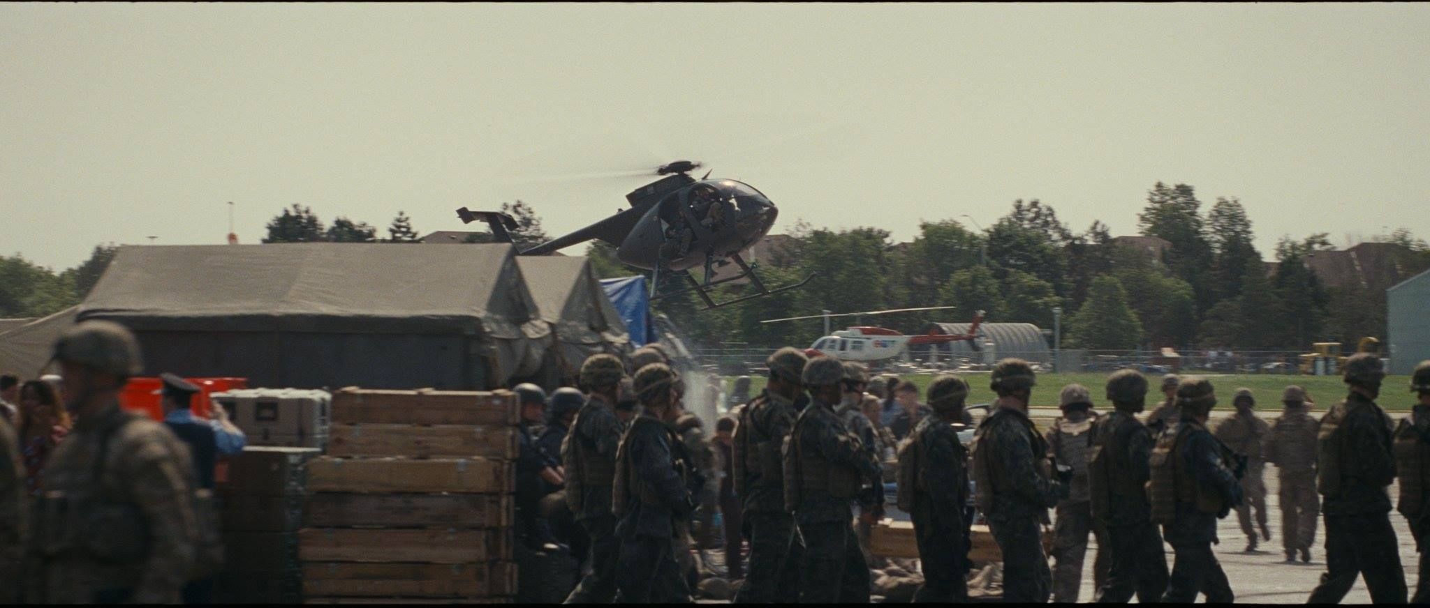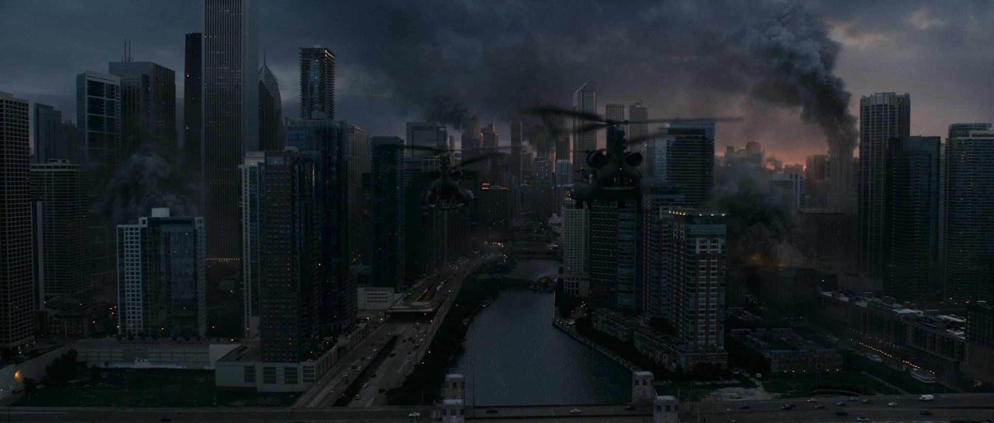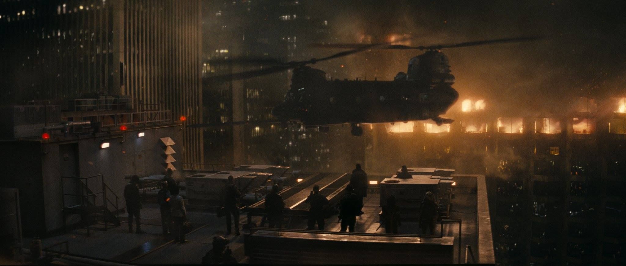 Los helicópteros y edificios destruidos se crearon en post-producción.