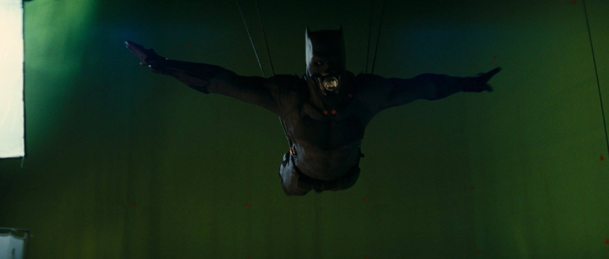 Tras pasar por post-producción, las cuerdas que sujetan a la actriz y la pantalla verde desaparecen para convertirse en la ciudad.