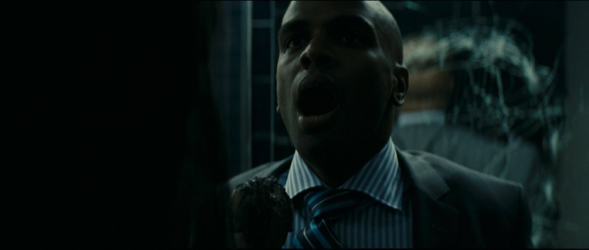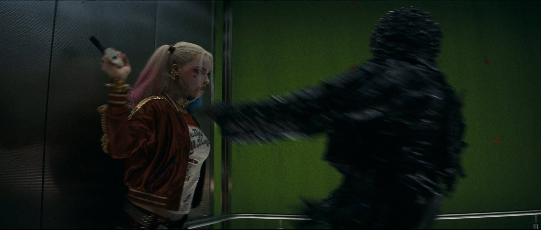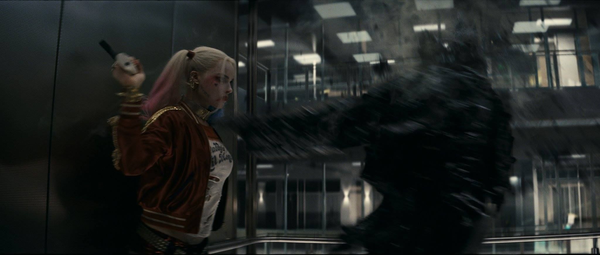 El monstruo al que se enfrenta Harley Quinn en la escena del ascensor sí es real, pero no la pared de cristal.