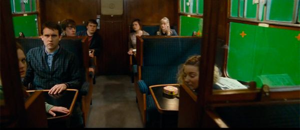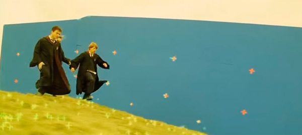 Harry, Ron y Hermione corren por los jardines de Hogwarts