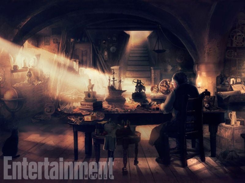 Maurice (Kevin Kline) y su hija viven una modesta vivienda que contrasta con la opulencia del castillo. Uno de los grandes retos a los que tuvo que enfrentarse el equipo fue el diseño de las cajas de música que crea el padre de Bella y que representan distintos lugares del mundo, aquellos a los que la protagonista le gustaría visitar.
