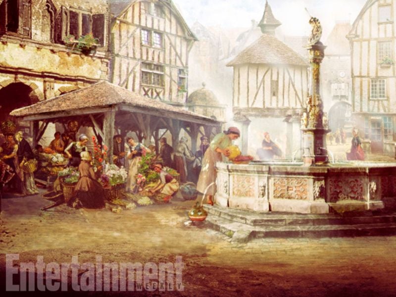 Primero pensaron ubicar la aldea de la película en un pueblo real francés, como Conques o Noyers-sur-Serein. En su lugar, la crearon desde cero en los estudios de rodaje y decidieron darle el nombre de Villeneuve, en honor a la autora original de la Bella y la Bestia.