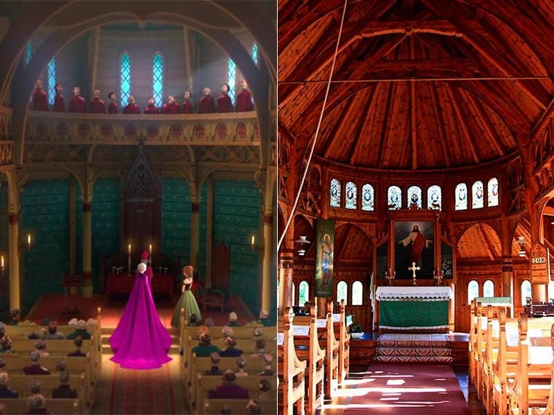 El equipo de la película exploró Escandinavia para crear el mundo de Elsa y Anna. Esta capilla se basa en la iglesia de San Olaf en Balestrand, Noruega.
