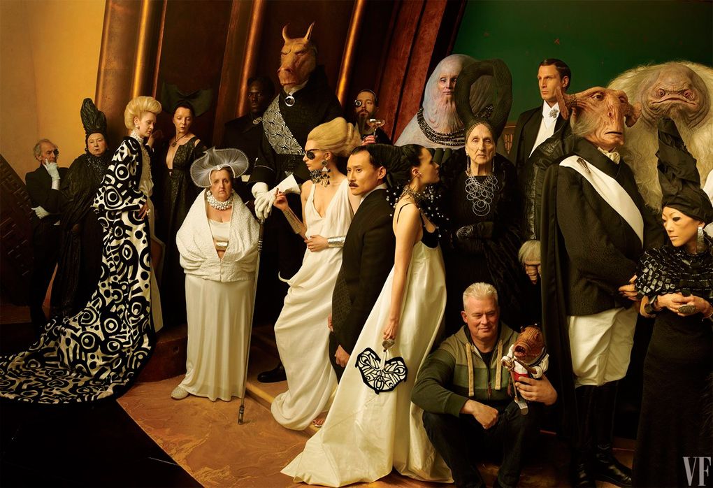 El diseñador de vestuario Michael Kaplan (sentado), rodeado por algunas de sus creaciones.