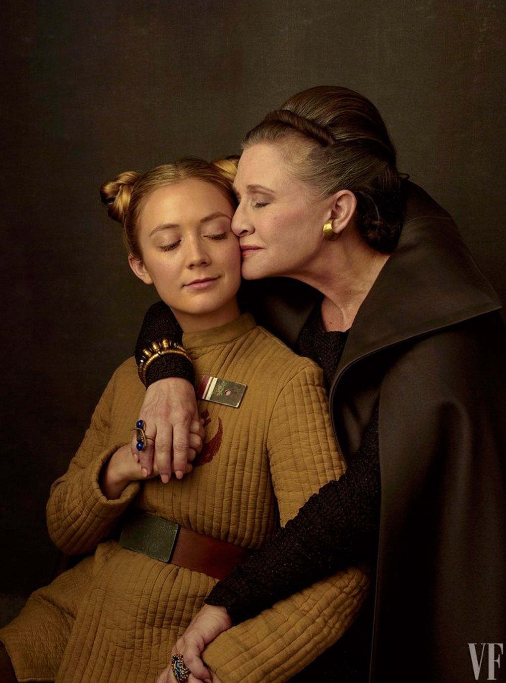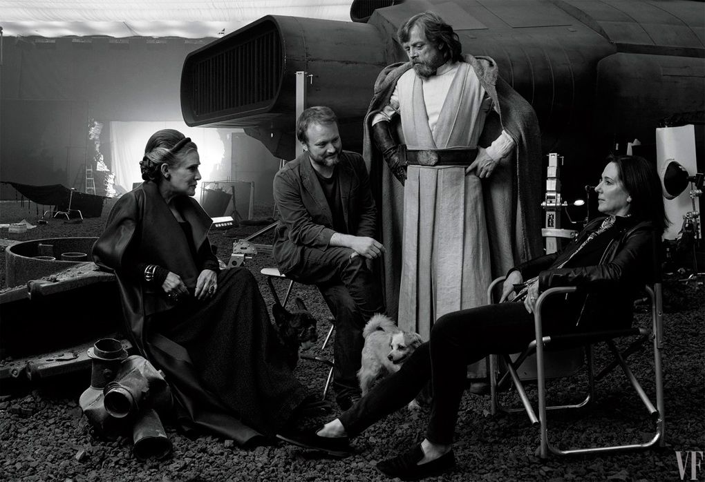 Carrie Fisher (General Leia Organa), el guionista y director Rian Johnson, Mark Hamill (Luke Skywalker), la productora Kathleen Kennedy y los perros de Fisher, Gary, y de la hija de Hamill, Millie.