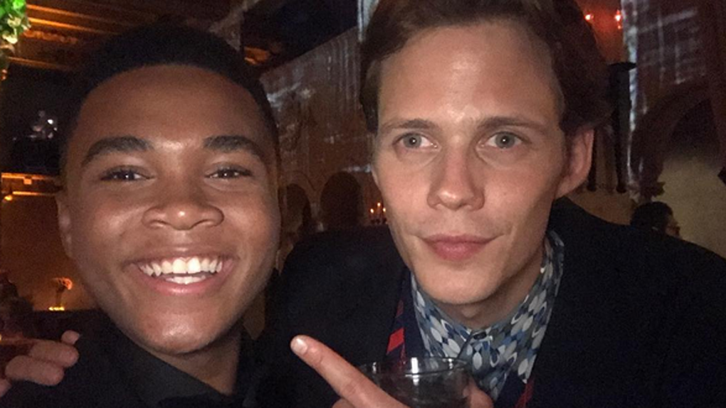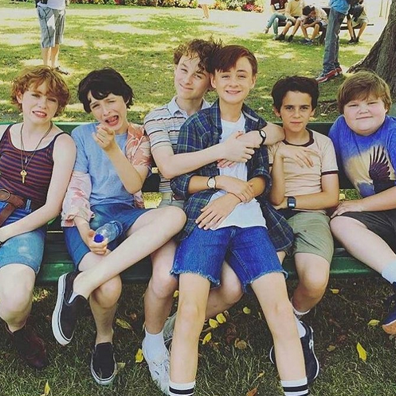 Finn Wolfhard enseñando algo en el móvil a sus amigos
