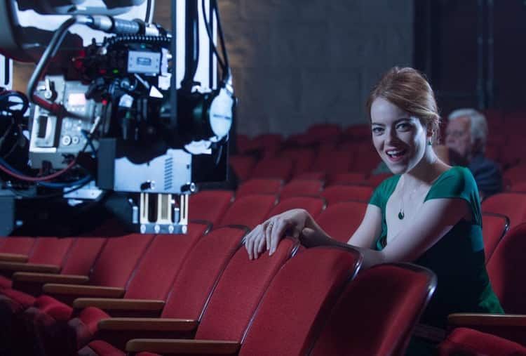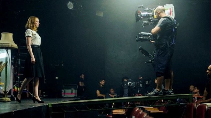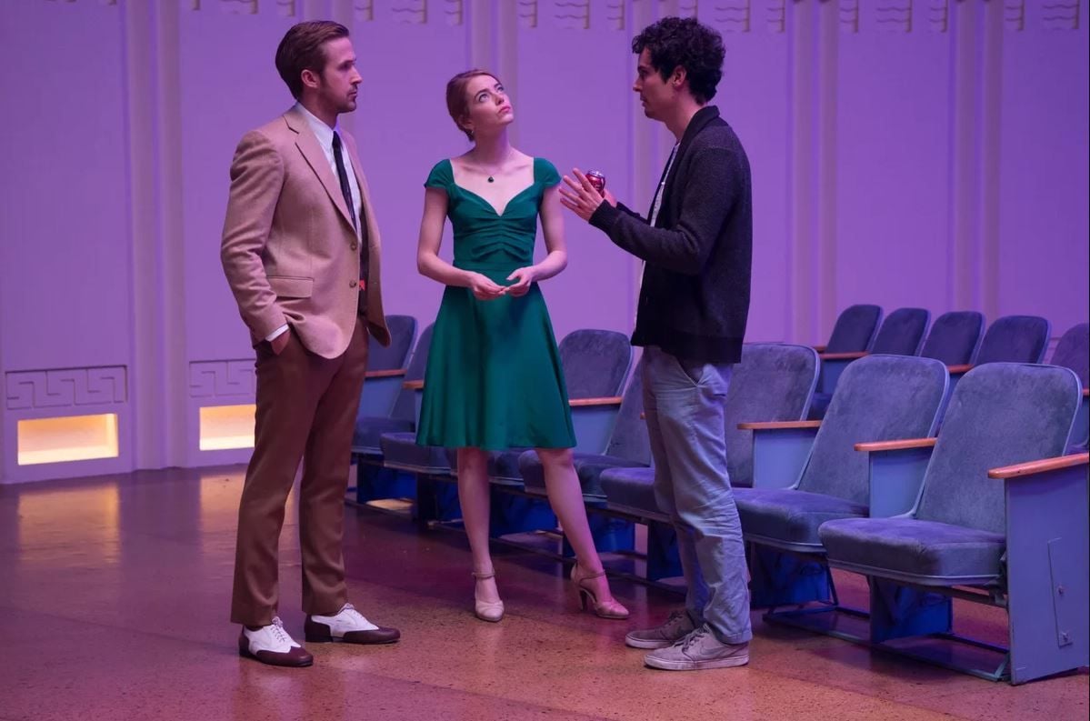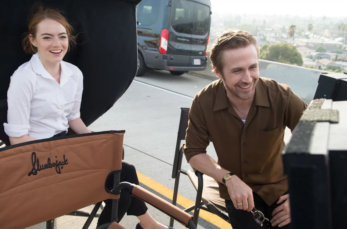 Ryan Gosling y Emma Stone escuchando las órdenes de su director.