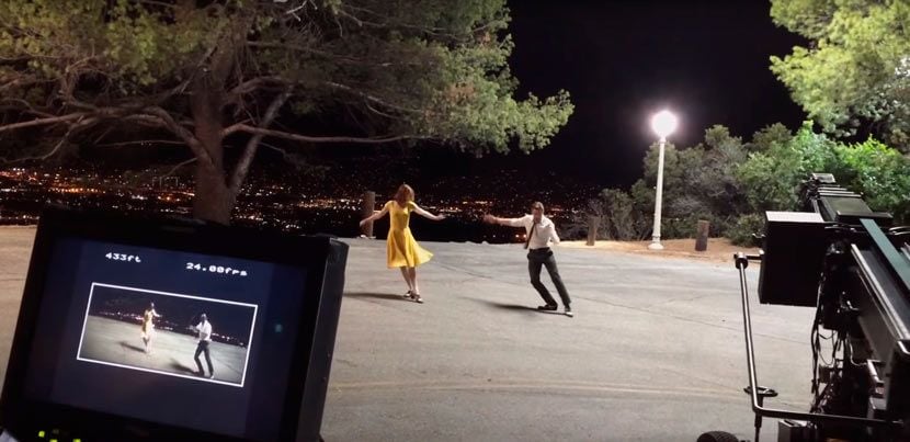 Ryan Gosling y Damien Chazelle preparando la escena inicial.