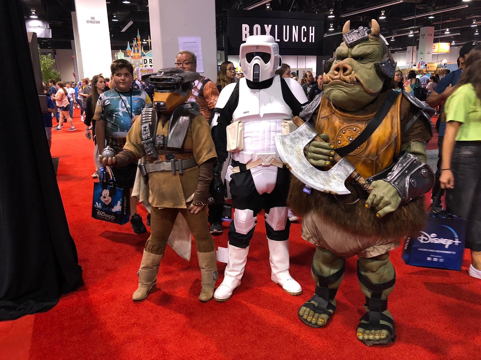 Leia disfrazada de Boushh, un Scot imperial y un guardia gamorreano del palacio de Jabba
