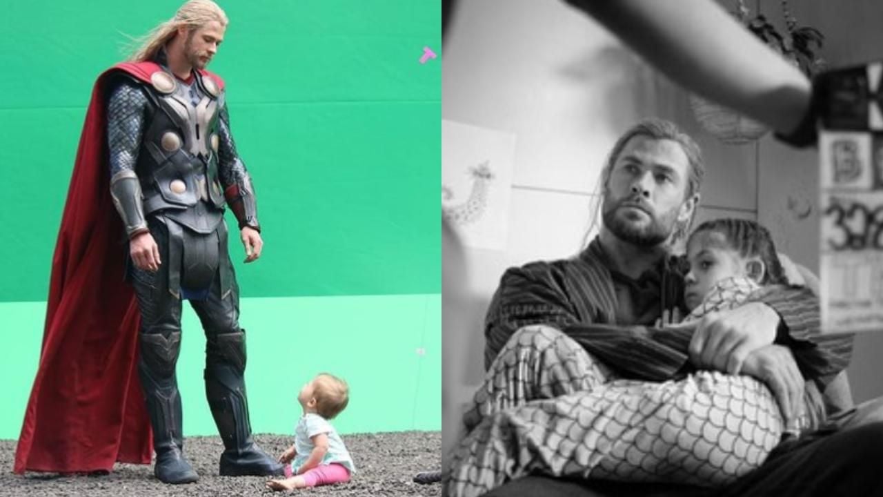 Chris Hemsworth compartió la comparativa de cómo su hija ha crecido en el set de Thor. En la izquierda, una imagen de su hija en el set de Thor, allá por 2010. En la derecha, en la última, Love and Thunder.