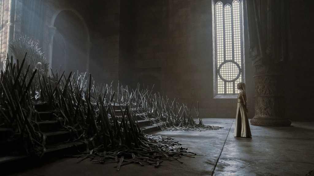 Este frame nos podría recordar a Daenerys en el último episodio de la temporada 8 mientras observa el Trono de Hierro con admiración y deseo. Sin embargo, el escenario ha cambiado notablemente. Aún así, no deja de ser un elemento icónico de Juego de Tronos.