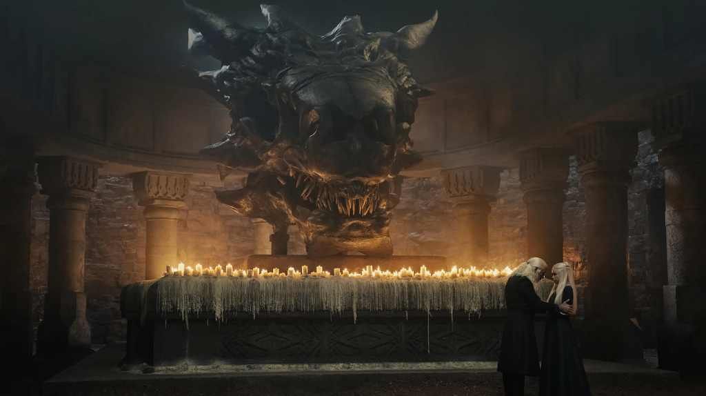 ¿Te suena esta calavera de dragón? Es Balerion, más conocido como el dragón más grande que jamás haya existido, y el último de los dragones que realmente nació en Valyria. En Juego de Tronos aparecía cubierto de polvo y en peores condiciones. Aquí, es el lugar espiritual de Viserys y el epicentro de grandes revelaciones.